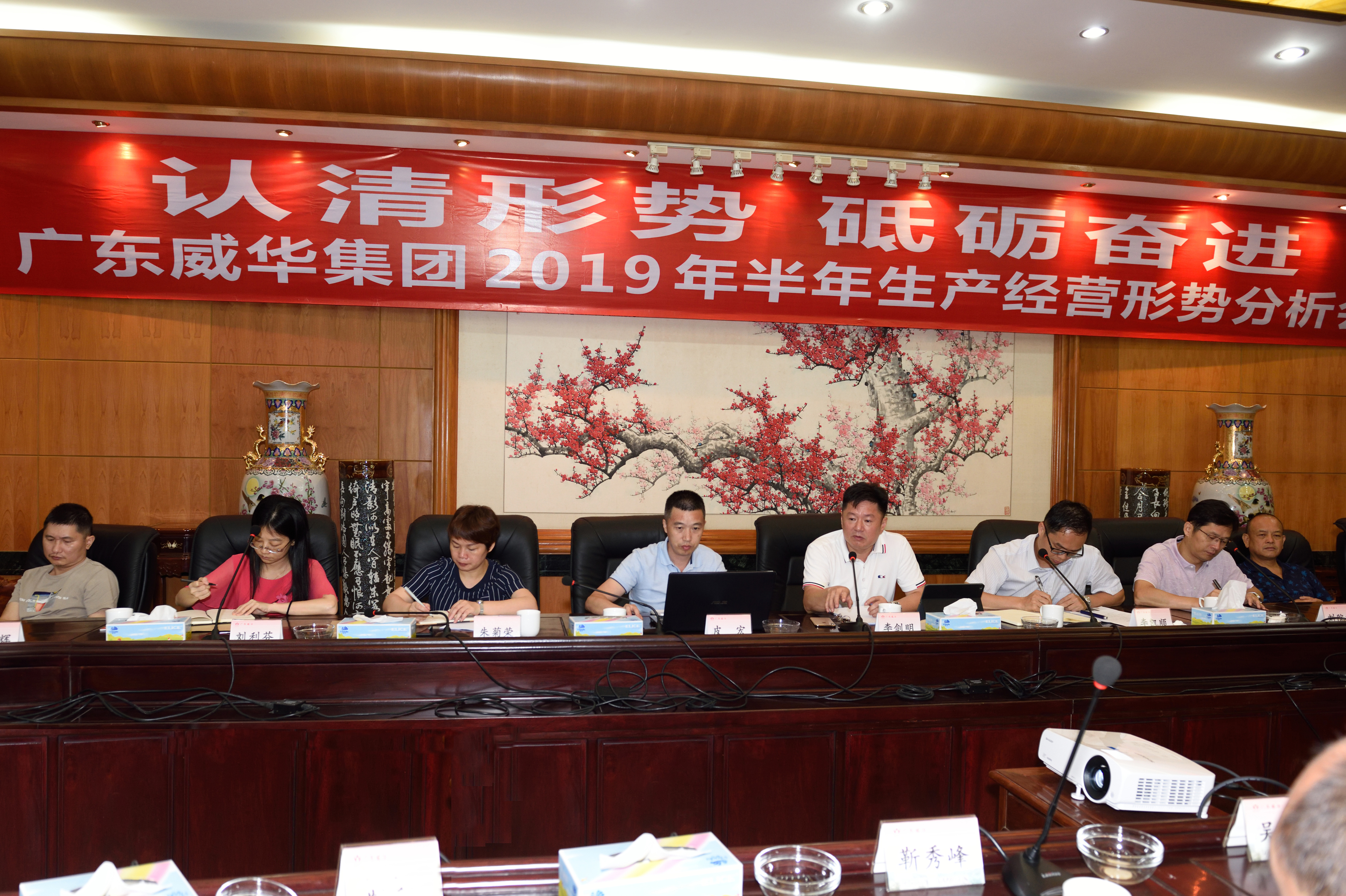 2019年7月11日,集团公司在梅州威华园召开2019年半年生产经营形势分析会议,集团公司总经理李剑明、部门负责人以上管理干部,各下属企业负责人等38人参加了会议,集团公司常务副总经理李凯顺主持会议。会议听取和讨论了威华茶博园设计方案,各企业第一负责人总结了上半年工作、汇报了下半年工作计划和目标,分析了各自面临的生产经营形势,并提出了应对方案。李剑明总经理对各企业工作情况做了点评,对各企业上半年主动作为,圆满完成上半年考核目标给予了肯定,对下半年工作提出了要求。
